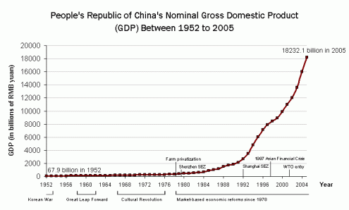 Tras la muerte de Mao a mediados de los 70, la China empezó una seria de reformas lideradas por Deng Xiaoping que llevaron a lo que se ha conocido como Economía Socialista de Mercado, En resumen: se permite la propiedad privada, y de hecho se fomenta, pero todo bajo el control del Partido Comunista, con una casta político empresarial extremadamente corrupta, y con un gran incentivo a la exportación basado en rebajas fiscales importantes. El PIB de la China empezó a crecer de manera exponencial.
