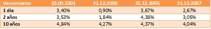 Qué raro, no? Primero bajan a corto plazo para paliar la crisis post 11-S y post-punto.com. Luego suben? Luego bajan otra vez? Y a todo eso el bono a 10 años, bajando en un periodo de seis años en los que la Administración Bush había acumulado 1.262 billones de déficits fiscales (gasto) y 1.920 billones en deuda extra-presupuestaria (inversiones y gastos a contabilizar en el futuro).