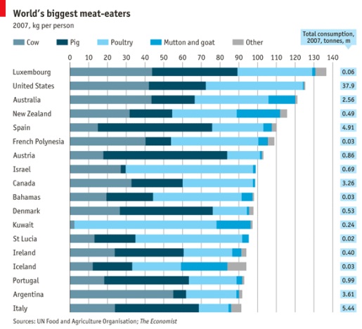 Hay datos que confirman que comer proteínas es de ricos (http://chartsbin.com/view/bhy). Los países con mayor PIB per cápita son los que más carne consumen por habitante. Hay excepciones de países muy pequeños con un turismo de alto nivel, que también salen muy arriba en la lista. Todos entenderemos que el consumo de carne de la Polinesia Francesa no tiene nada que ver con sus tradiciones gastronómicas (fécula y pescado), ni con
