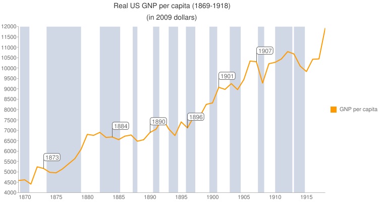 Hay que entender que estos crecimientos eran increíbles para la época, y hay que incluir el incremento de población, por lo que los crecimientos medios anuales de PIB desde 1870 hasta 1910 fueron del 4%. Para tener una idea, España creció al 4% en los mejores años de la locura inmobiliaria. Pues bien, el crecimiento de la “Guilded Age” americana fue ese mismo durante cuatro décadas seguidas. Estamos hablando de la media, ya que hubo años de crisis, como en 1873.