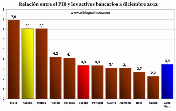 También está muy de moda comparar magnitudes del sector financiero con el PIB. La estrella de la semana es comparar los activos bancarios de un país con su PIB.
