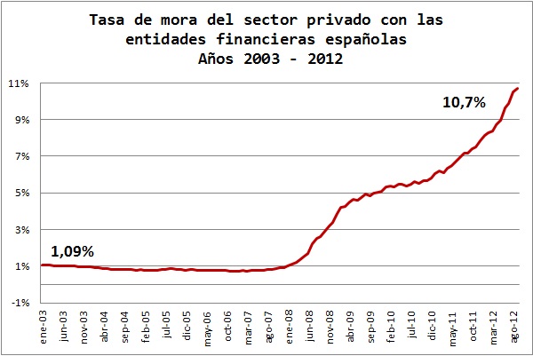 hay que combinarlo con los créditos morosos sobre el total de créditos. En 2013 hemos llegado a superar el 12%. Este 12% es lo que se declara, pero es bastante obvio que los bancos refinancian muchos créditos dudosos para no tener que declarar una pérdida. Por lo tanto, ya podemos medir cual es el impacto de la morosidad: