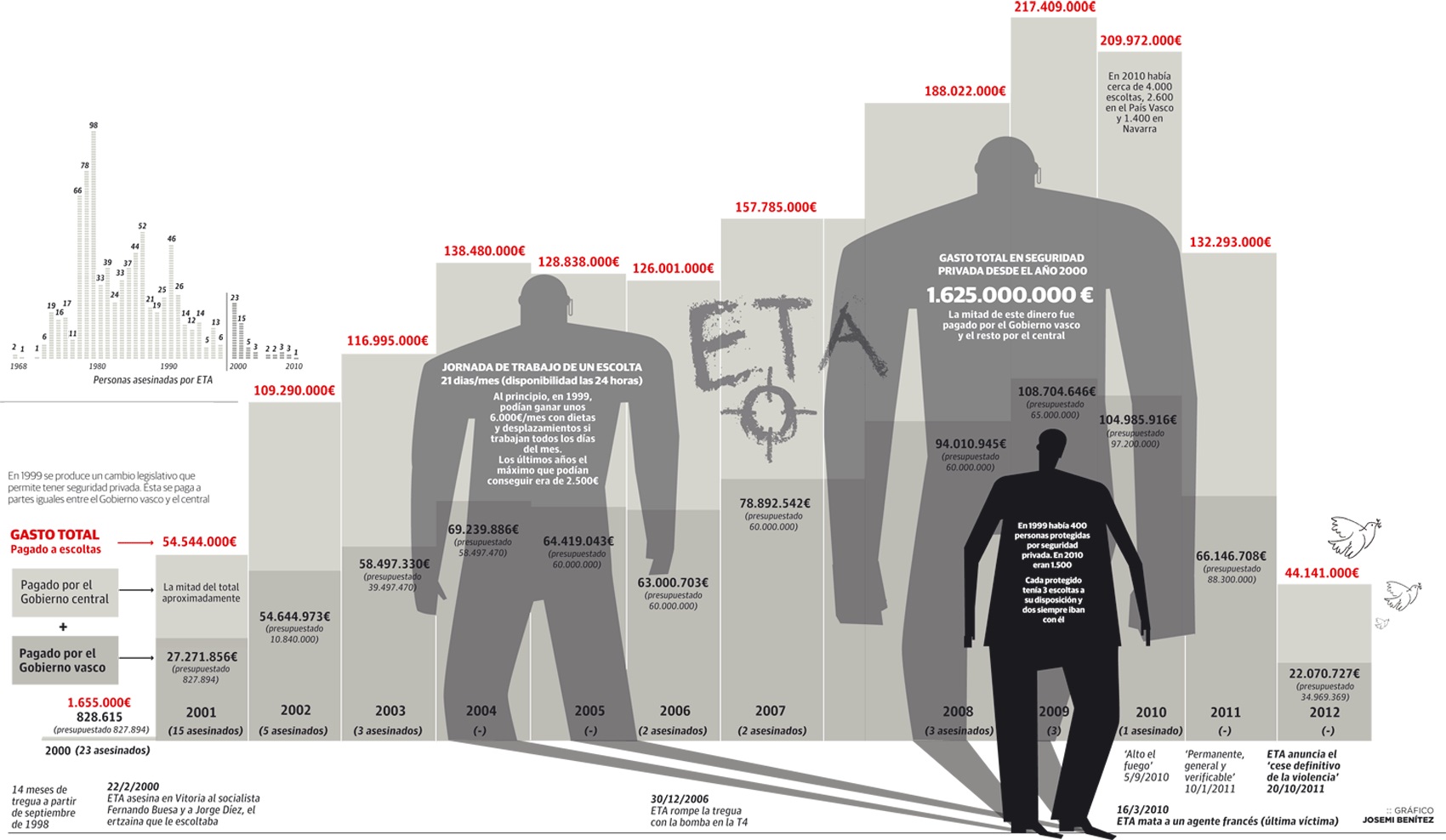 que durante muchos años protegieron a políticos y empresarios de la amenaza de la banda terrorista de ETA. La desaparición, en principio, de la amenaza de ETA, la pacificación palpable en el País Vasco y la crisis económica, han hecho rebajar los presupuestos de seguridad privada de empresas e instituciones, y por lo tanto, los ingresos de las empresas de seguridad privada. De mis años en banca, recuerdo que tres agentes de seguridad de Prosegur, que el banco contrataba para la entrada del garaje, se fueron a las divisiones de seguridad personal (guardaespaldas) de su compañía. Uno de ellos me dijo que se cobraba más dinero, y que las propinas de los defendidos eran muy buenas, en su caso.